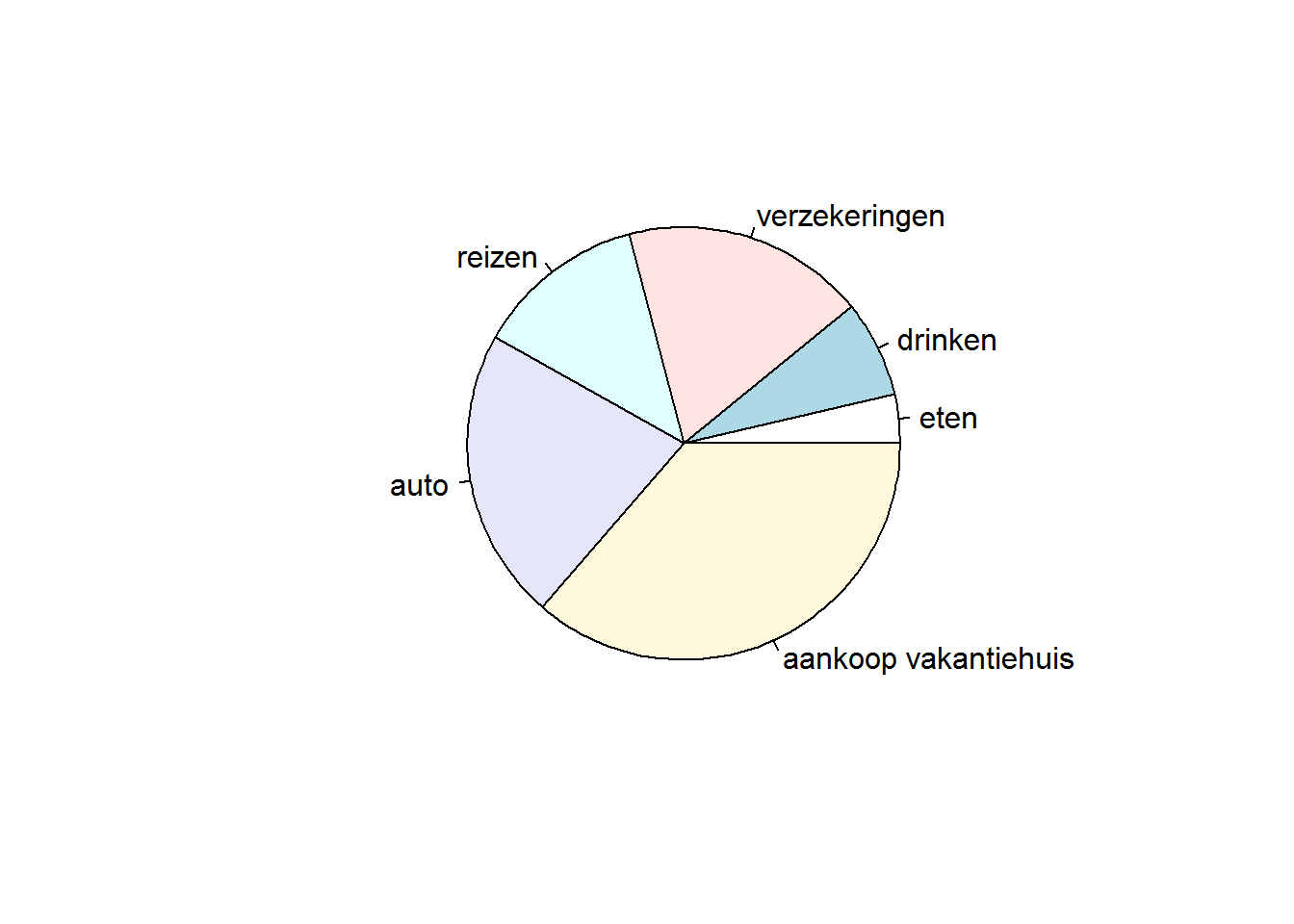 Voor een grafische voorstelling van kwalitatieve data wordt vaak gebruik gemaakt van een taartdiagram. Hieronder is zo een plot uitgewerkt in R-code, gebruik makend van de laatst ingevoerde data hierboven: