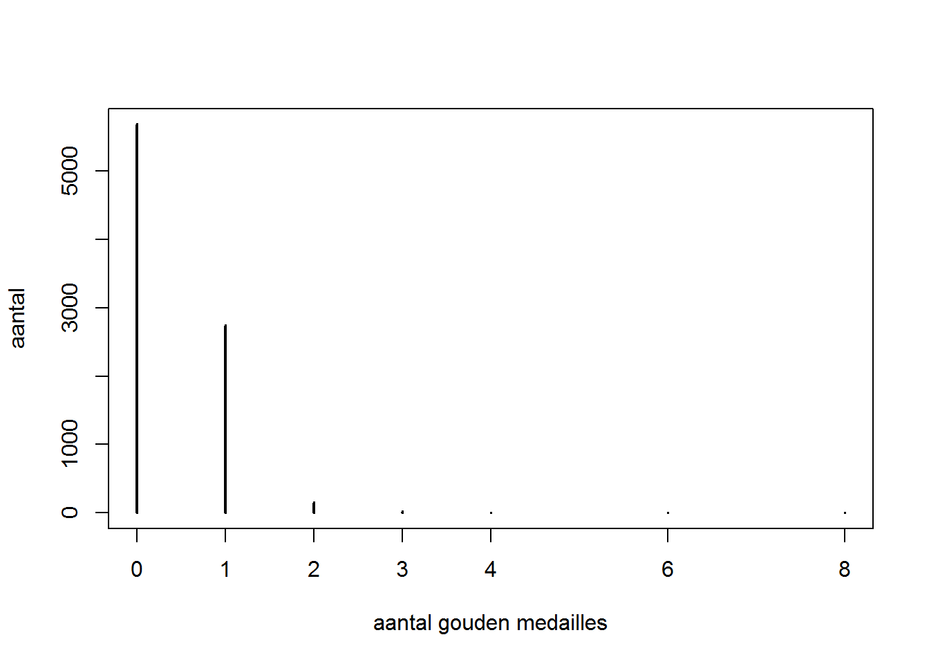 Een staaf diagram kan gebruikt worden om discrete kwantitatieve data voor te stellen. Zo kan je bv. in R aan de hand van de functie table, tellen hoe vaak een atleet 0, 1, 2, … 8 gouden medailles gewonnen heeft bij een deelname aan de Olympische Spelen:
