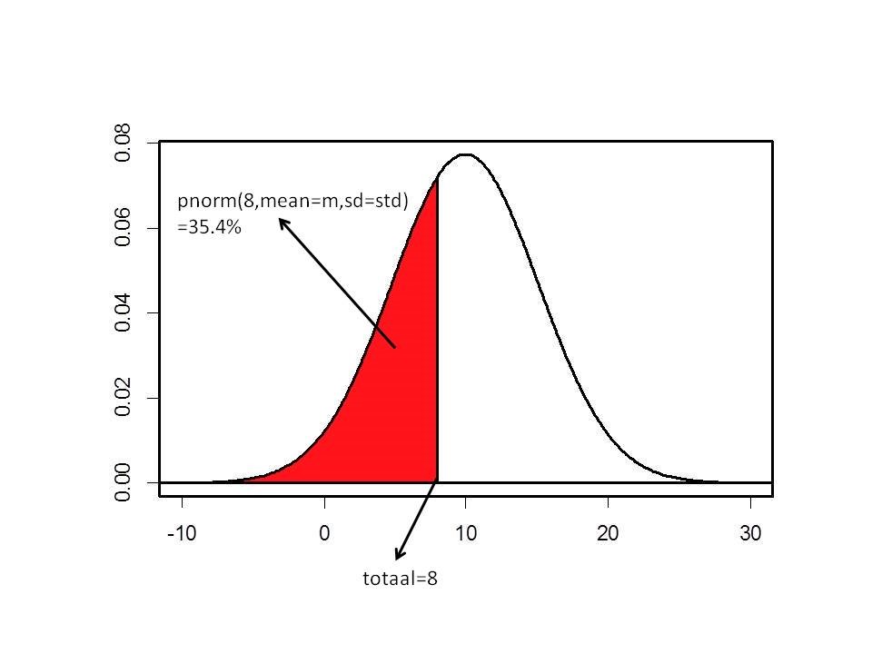De functie pnorm berekent de oppervlakte onder de normale verdeling links van de score 8. Dit wordt ook weergegeven in onderstaande figuur: