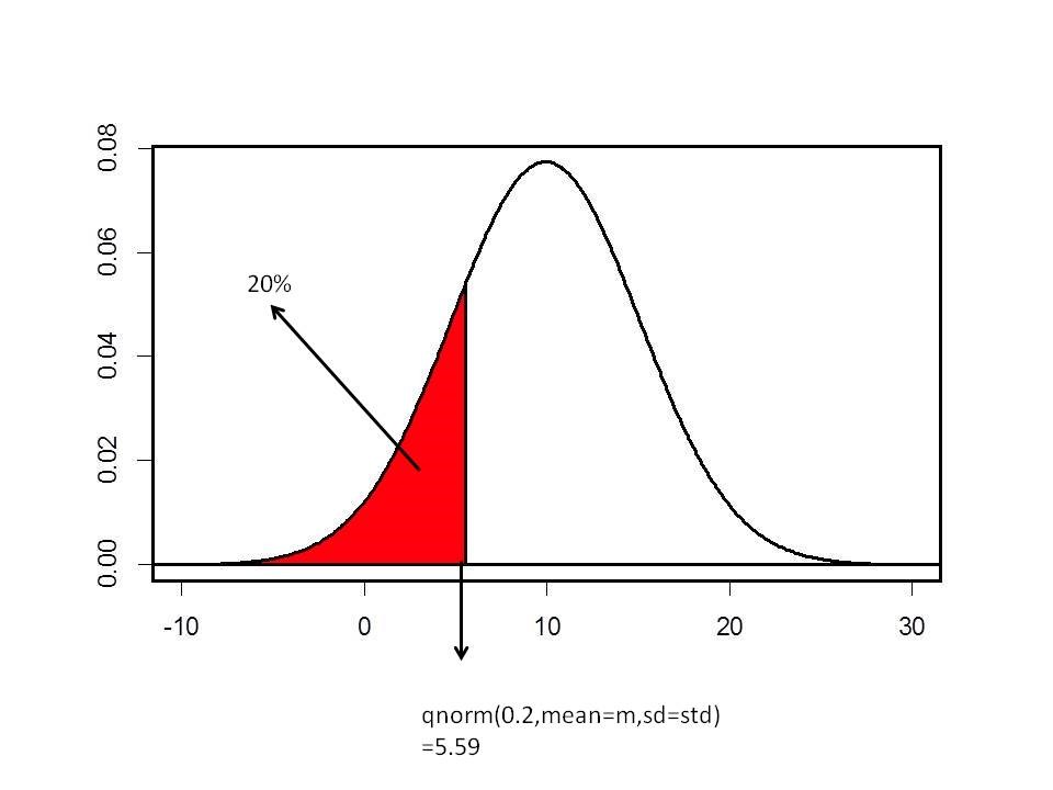 De tweede vraag slaat niet op een percentiel, maar een kwantiel. Dit kan via de functie qnorm berekend worden. Zoals bij de pnorm functie gaat ook de functie qnorm de normale verdeling van de linker kant benaderen. De 20% slechtste studenten kan dus berekend worden als: