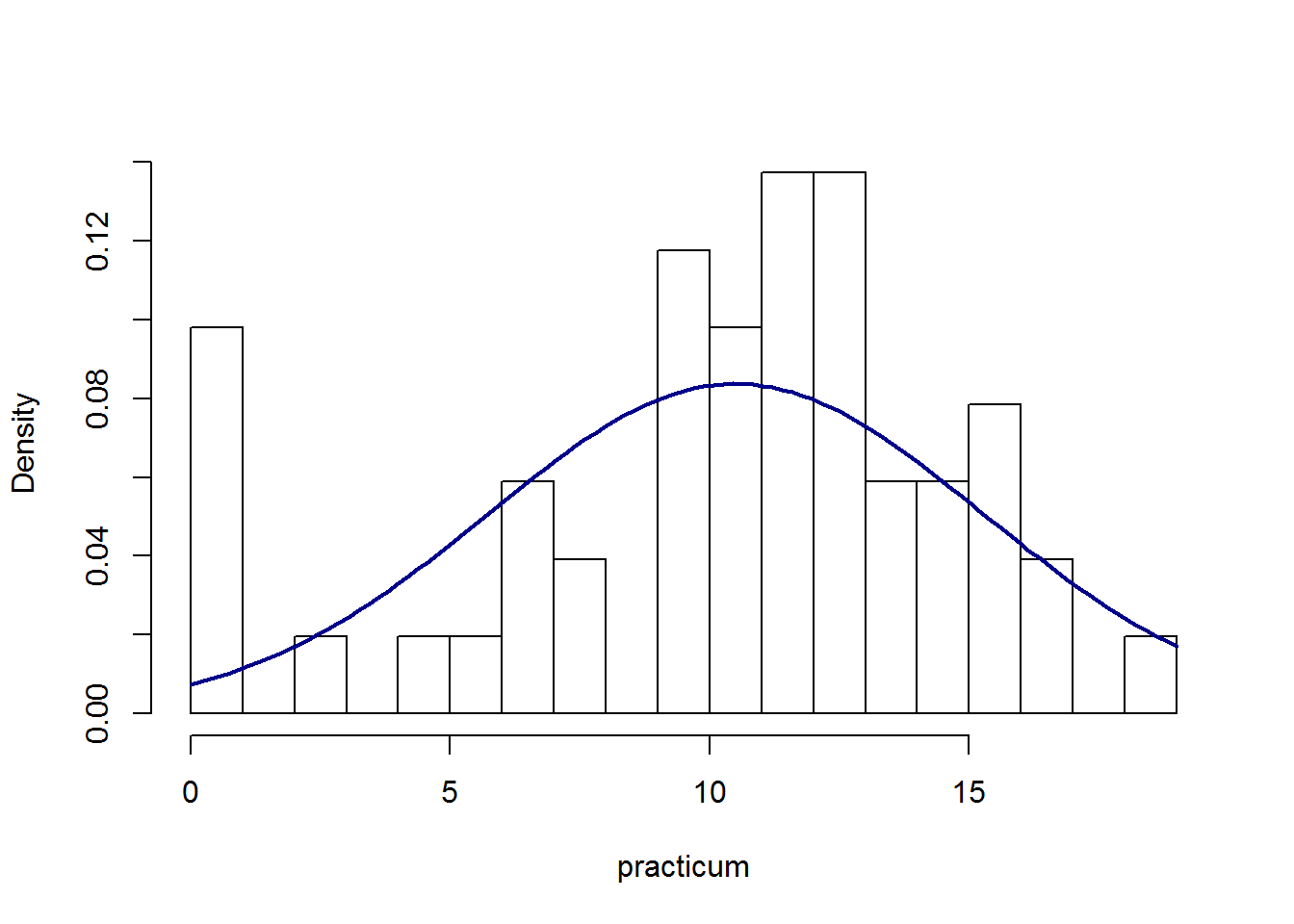 Of het al dan niet geoorloofd is om hier de normale verdeling toe te passen is een keuze die gemaakt moet worden. Er zijn niet altijd eenduidige regels wanneer welke keuze gemaakt moet worden. We gaan hier ervan uit dat de verdeling voldoende overeen komt met een normale verdeling. Het gemiddelde is gelijk aan 9.93, met een standaardafwijking van 5.16.