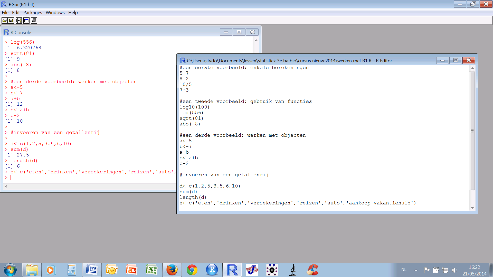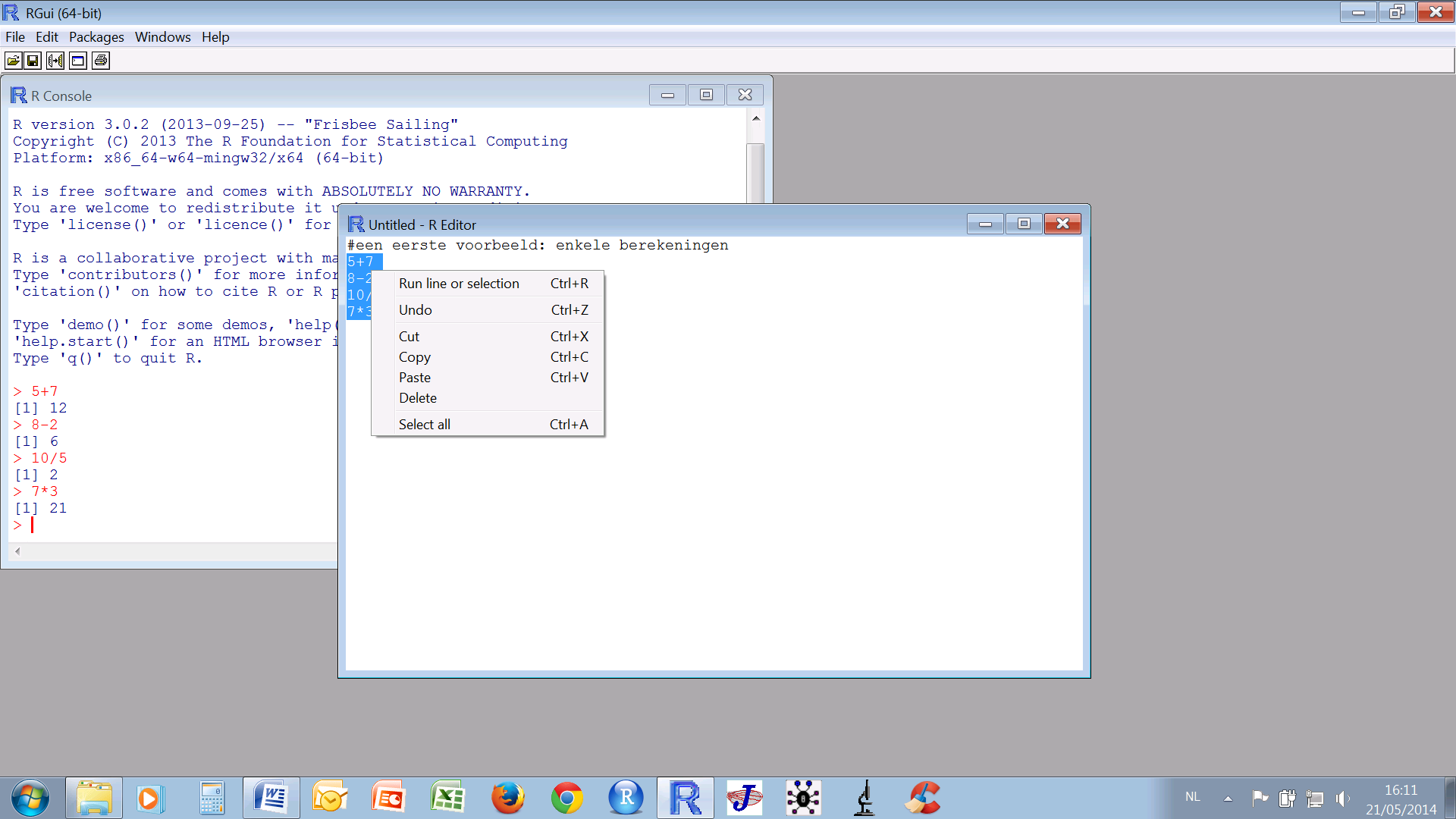 Dit laat je toe om enkele eenvoudige berekeningen te laten maken door R. Wanneer je een ‘#’ vooraan plaatst, zal dit stukje code niet uitgevoerd worden, zo kan je dus commentaren aan je code toevoegen. Merk ook op dat bij het intikken van de code er niets gebeurd. Inderdaad, nu moet je aan het pakket duidelijk maken dat die berekeningen uitgevoerd moeten worden. Hiervoor selecteer je het stuk van de code dat je uitgevoerd wil zien, en klik je via de rechter muisknop op Run line or selection. De code wordt naar de R console gekopieerd en uitgevoerd zodanig dat je de resultaten te zien krijgt:
