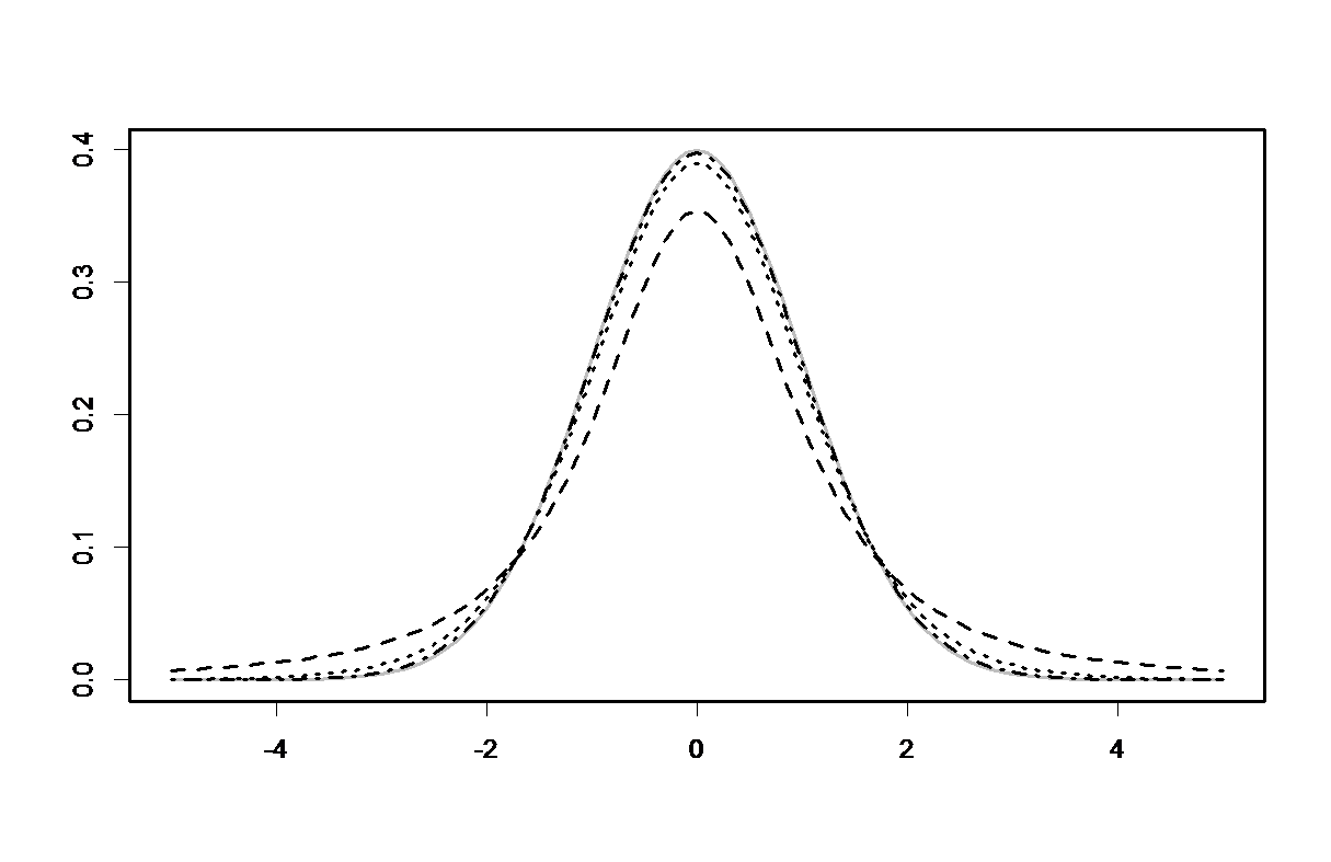 Een t-verdeling ziet er vrijwel hetzelfde uit als een standaard normaal verdeling, behalve dat de staarten een beetje ‘dikker’ zijn. De vorm van de t-verdeling hangt af van het aantal vrijheidsgraden, welke gelijk zijn aan n-1 voor deze methode. In bovenstaande figuur zie je de standaard normaal verdeling (grijs) en enkele t-verdelingen met resp. 2, 10 en 50 vrijheidsgraden. Naarmate dat het aantal vrijheidsgraden (en dus de steekproefgrootte) groter worden, komt de t-verdeling dichter bij de standaard normaal verdeling te liggen.