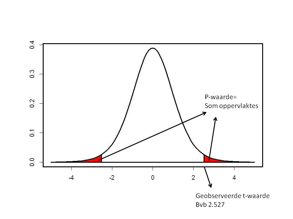 Tot slot, en veruit het vaakst toegepast, kunnen hypotheses ook getoetst worden via een z.g. p-waarde. De berekende waarde voor T wordt dan niet vergeleken met een kritische waarde, maar de kans om een extremer resultaat te bekomen (wanneer H0 waar is) wordt berekend op basis van de t-verdeling: