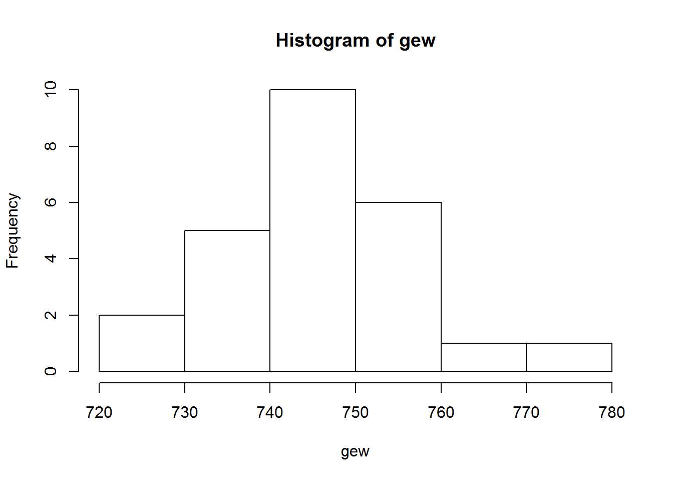 In statistische termen start een test altijd met het opstellen van een nul hypothese H0 en een alternatieve hypothese Ha. Stel je wilt nagaan of er gorilla’s voorkomen in de Ardennen. Dan kan je vanuit statistisch oogpunt je hypothese op twee manieren formuleren: er zitten geen gorilla’s in de Ardennen of er zitten wel gorilla’s in de Ardennen. Beide omvatten dezelfde idee, maar slechts 1 van hen kan verworpen worden. De tweede formulering kan je nooit verwerpen. Het is niet omdat je geen gorilla’s gezien hebt, dat ze er niet zitten, of m.a.w., de afwezigheid van bewijsmateriaal is niet hetzelfde als het bewijs van afwezigheid. Daar tegenover staat dat vanaf het moment dat je een gorilla gezien hebt in de Ardennen, je de eerste formulering kan verwerpen: aanwezigheid bewijst het niet afwezig zijn. Op deze manier worden statistische hypotheses geformuleerd. Laten we verder gaan met een meer realistisch voorbeeld. Stel je wilt nagaan of het bedrijf Kellogg’s het juiste gewicht in zijn family packs cornflakes doet, nl. 750g. Je zou dit kunnen nagaan door bv. een lukrake steekproef van cornflakes pakken te kopen, en van elk pak het gewicht bepalen. Onderstaande code simuleert dit in R: