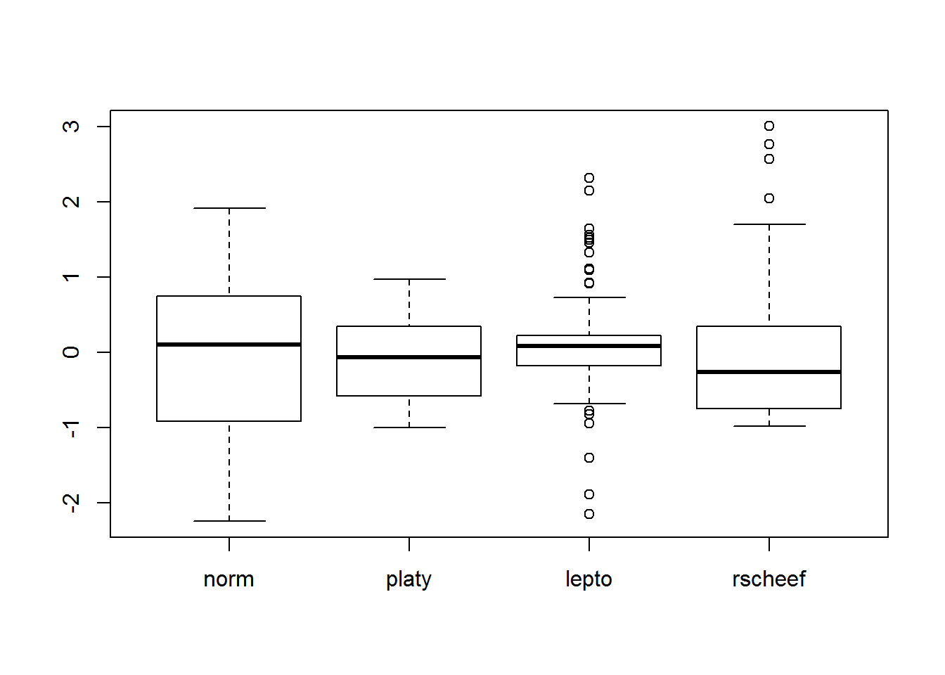 We hebben nu kennis gemaakt met verschillende kengetallen, die ons iets kunnen leren over de locatie, spreiding en vorm van een verdeling. Een soort van plot dat vaak gebruikt wordt om een samenvatting van de verdeling te geven, of te vergelijken tussen verschillende steekproeven is de boxplot. Deze wordt opgesteld gebruik makend van de vijf kengetallen die de functie fivenum functie berekent, namelijk het minimum, maximum en de drie kwartielen. In een eerste stap wordt de box gevormd door \(Q_1\) en \(Q_3\), en de mediaan (\(Q_2\)) wordt in de box aangegeven door een dikke lijn. Daarna worden de zgn. fences gevormd. Hiervoor worden eerst twee hypothetische grenzen berekend als \(Q_1-1.5*(Q_3-Q_1)\) en \(Q_3+1.5*(Q_3-Q_1)\). De meest extreme datapunten die nog wel binnen deze grenzen vallen worden gebruikt om de fences te tekenen. Punten die hier buiten vallen worden als (milde) outliers of uitschieters beschouwd. Niet alleen kan de ligging en spreiding gemakkelijk afgelezen worden van de boxplot, ook vormkenmerken en verschillen kunnen gemakkelijk gevisualiseerd worden. In onderstaande plot staan 4 boxplots. De meest linkse is normaal verdeeld (dus met scheefheid en gepiektheid gelijk aan nul). Daarnaast en in volgorde van links naar rechts staan boxplots van een platykurtische (negatieve kurtosis), leptokurtische (positieve kurtosis) en rechtsscheve (positieve skewness) verdeling. Deze kenmerken zijn respectievelijk vast te stellen aan de hand van relatief korte fences, relatief lange fences en fences met verschillende lengtes.