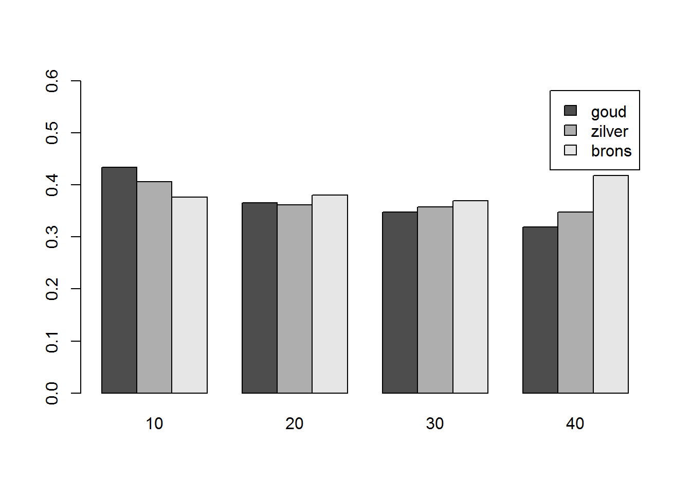 Zulke kruistabellen zijn toepasbaar voor alle types van data. De hierboven opgestelde kruistabel bevat erg grote waarden en is moeilijk in een plot te gieten. Laten we daarom voor elke leeftijdscategorie het gemiddelde aantal gouden, zilveren en bronzen medailles berekenen, gebruik makend van de tapply functie.
