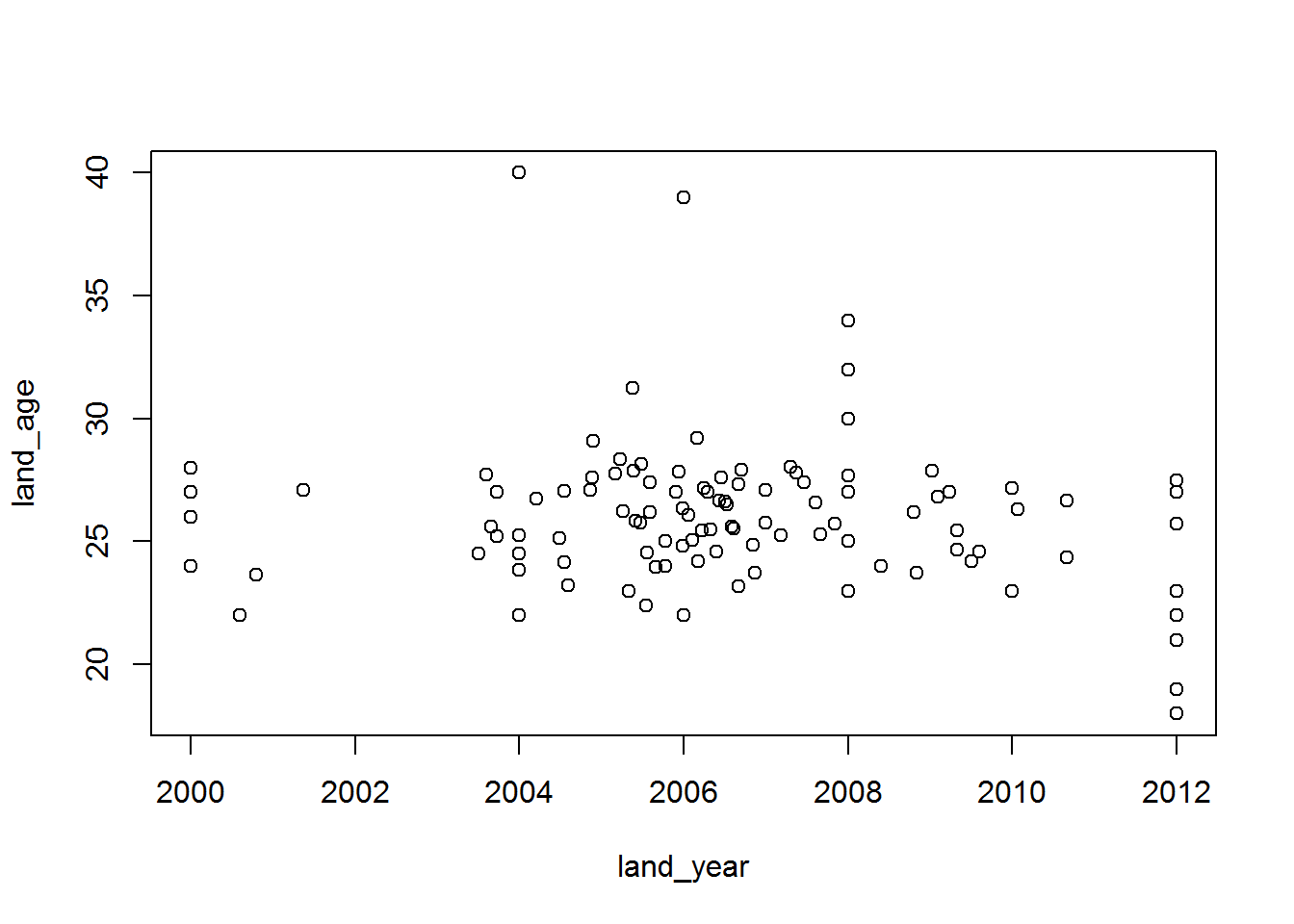 Tot slot, maken we een scatterplot van de gemiddelde leeftijd en jaar van deelname per land, om te bekijken in hoeverre er een associatie is tussen beide.