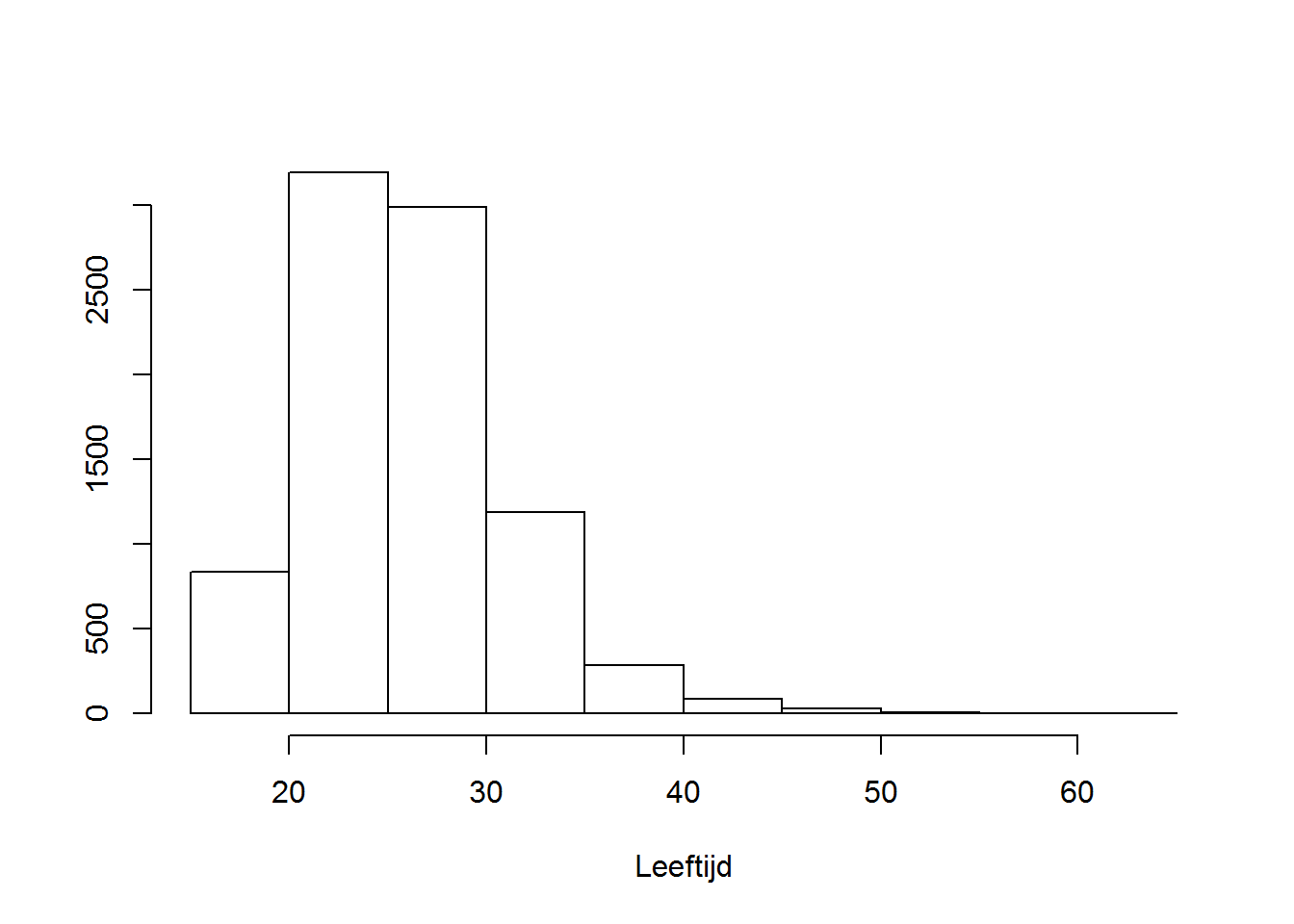 Kwantitatieve data kunnen op verschillende manieren voorgesteld worden. Elke methode heeft zo zijn voor en nadelen. We zetten de meest gebruikte manieren hieronder even op een rijtje. Hiervoor wordt gebruik gemaakt van een uitgebreide dataset waarin alle medaille winnaars tijdens Olympische spelen in deze eeuw zijn opgelijst per atleet en jaar van deelname. Tevens zijn de leeftijden, sportdiscipline en land van herkomst gekend. Deze data heb ik van het web geplukt, in Excel omgezet tot een txt bestand. Je kunt dat bestand in R opladen met de functie read.table. LET OP, je moet eerst klikken op het file icoontje, en dan op change dir, om te specificeren in welke folder het databestand staat. Het volgende stukje code leest de data in, maakt de inhoud beschikbaar voor de functies die we gaan gebruiken (attach()) en lijst de namen van de variabelen op (names()).