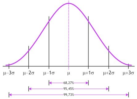 Gemiddelde en standaarddeviatie beschrijven de ligging en breedte van de normale verdeling. De vorm ligt vast. Uit onderstaande figuur kan je afleiden dat ongeveer 68% van de massa onder de normale verdeling (dus 68% van de populatie) zich tussen \(\mu-\sigma\) en \(\mu+\sigma\) bevinden (dit zijn tevens de buigpunten van de normale verdeling). een vaak gebruikt interval (zie ook hoofdstuk over de binomiale verdeling) is het 95% interval. We kunnen vaststellen dat ongeveer 95% van de data tussen \(\mu-2\sigma\) en \(\mu+2\sigma\) bevinden. Een interval tussen \(\mu-3\sigma\) en \(\mu+3\sigma\) bevat 99.7 % van alle data, zodat vaak gesteld wordt dat gegevens die buiten dit interval bevinden als ‘uitzonderlijk’ beschouwd kunnen worden. Men spreekt dan ook van ‘uitbijters’, ‘uitschieters’ of ‘outliers’.