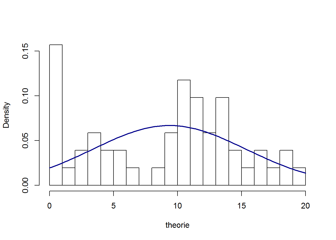 Of het al dan niet geoorloofd is om hier de normale verdeling toe te passen is een keuze die gemaakt moet worden. Er zijn niet altijd eenduidige regels wanneer welke keuze gemaakt moet worden. We gaan hier ervan uit dat de verdeling voldoende overeen komt met een normale verdeling. Het gemiddelde is gelijk aan 9.93, met een standaardafwijking van 5.16.