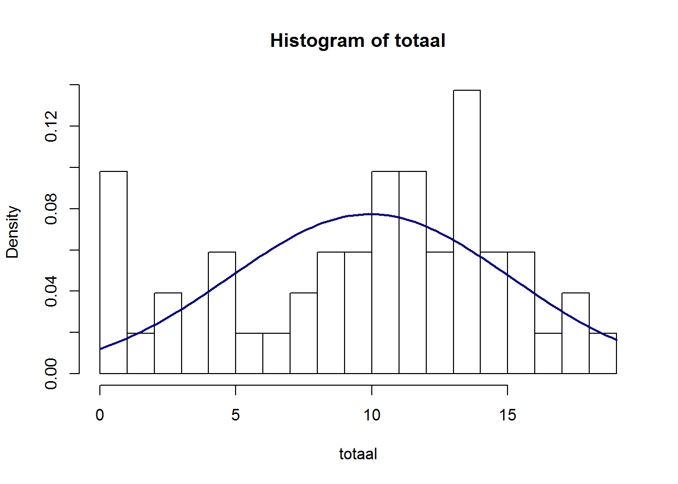 In beide gevallen zien we substantiële afwijkingen van normaliteit. Wanneer we de totale score op 20 berekenen en dezelfde figuren bekijken zien we dat de normale verdeling al beter benaderd wordt (maar zeker niet perfect).