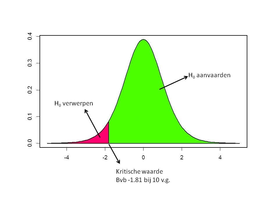 Deze volgt een t-verdeling met n-1 vrijheidsgraden wanneer H0 correct is. Het is dan mogelijk om deze t-verdeling in te delen in een aanvaardingsregio en een verwerpingsregio. Voor tweezijdige tests worden de grenzen van deze regio gegeven door \(t_{0.025,n-1}\) en \(t_{0.975,n-1}\). Voor eenzijdige tests wordt, zoals bij het opstellen van betrouwbaarheidsintervallen de grens gegeven door \(t_{0.05,n-1}\) of \(t_{0.95,n-1}\).