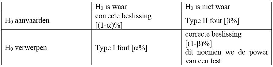 In een van de eerste passages van deze cursus wordt vermeld dat met statistiek niets bewezen kan worden en dat er enkel uitspraken gedaan worden in termen van kansen. Dit impliceert dat er dus fouten gemaakt worden en dat het niet mogelijk is om in te schatten wanneer zulke fouten optreden. In relatie tot het toetsen van hypotheses zijn er 4 mogelijke combinaties, waarvan er 2 leiden tot een foute uitspraak. Dit staat in volgende tabel samengevat: